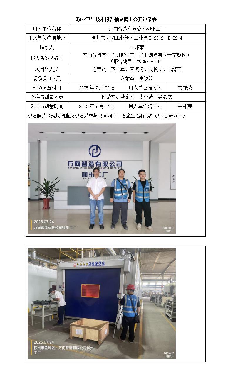 萬向智造有限公司柳州工廠職業(yè)病危害因素定期檢測 (報告編號:YQ25-1-115)