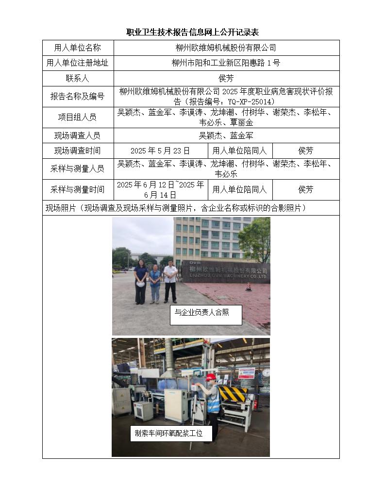 《柳州歐維姆機(jī)械股份有限公司2025年度職業(yè)病危害現(xiàn)狀評(píng)價(jià)報(bào)告》